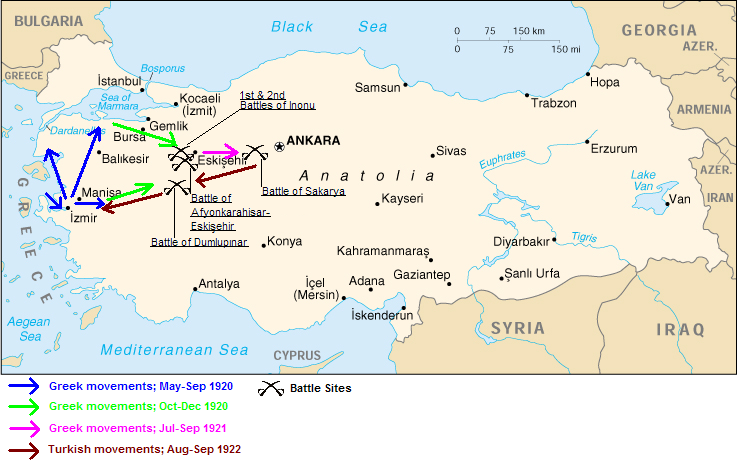 1921년 8월 23일부터 9월 13일까지 무려 3주일 동안 밤낮없이 양군이 격돌한 사카리야 전투에서 터키 국민회의군은 그리스군을 결정적으로 괴멸시켰습니다. 이 패배로 많은 전사자를 내고 사기도 떨어진 그리스는 후퇴를 거듭했습니다. 드디어 국민회의군은 그리스군의 본거지인 스미르나(현재는 이즈미르)를 점령합니다.