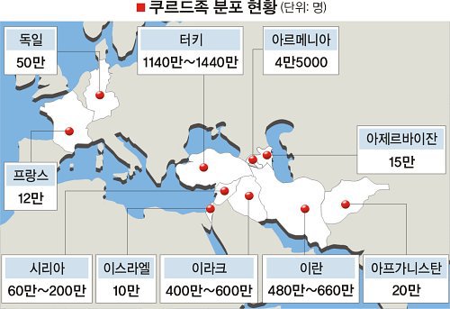 2009년에는 우리나라의 석유공사와 SK이노베이션이 쿠르드 자치정부와 유전개발에 합의했으나 이라크 중앙정부는 화를 내면서 우리나라에 석유공급을 1년간 중단하고 이라크 남부지역의 유전개발에 대한 석유공사와 SK이노베이션 참여를 수년간 금지했습니다. 우리 자이툰 부대가 주둔했던 아르빌도 쿠르드 자치구에 속해 있습니다.