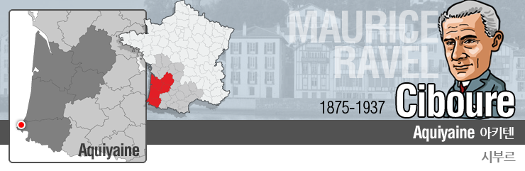 라벨은 스페인 국경에 인접한 프랑스 서남부의 소도시 시부르에서 태어났습니다. 시부르의 강변도로에 있는 관광 안내소 앞에서 발걸음을 멈추고, 건물 입구 벽면에 ‘이 집에서 모리스 라벨이 1875년 3월 7일에 태어났다’라는 표시에 눈길을 던집니다. 라벨의 아버지는 스위스 출신이었고, 어머니는 바스크(1) 여인이었으니 그의 혈관 속에 반은 바스크족의 피가 흐르고 있었던 셈입니다.