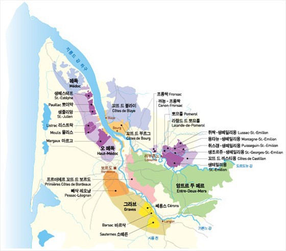 보르도의 와인 지역은 그리고 메독과 생떼밀리옹으로 크게 나뉩니다. 그리고 보르도 남쪽의 그라브나 소테른은 백(白) 포도주로 이름 높은 곳이기도 합니다.