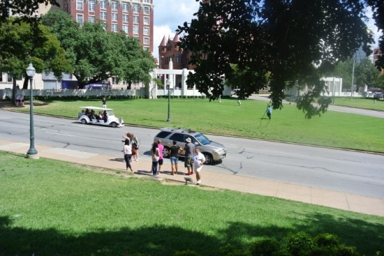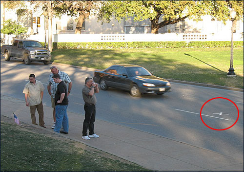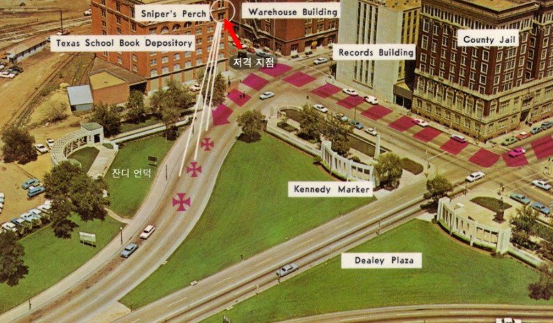 오후 12시 30분 직전에 케네디의 자동차 행렬은 메인 스트리트의 딜리 플라자로 들어와 휴스턴 스트리트에서 우회전합니다. 그리고 한 구역 지난 후 교과서 창고 밑에 있는 엘름 스트리트 쪽으로 좌회전했습니다. 이것은 거의 120도 회전이어서 그때 자동차 행렬의 속도가 시속 16km로 떨어졌습니다.