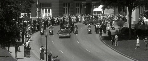 가장 먼저 두 대의 오토바이가 왔고 그 뒤를 이어 케네디의 리무진이 왔는데 대통령과 재키는 뒷좌석에 탔고 코널리 주지사 부부는 앞좌석에 탔습니다. 엘름 스트리트 연도의 군중들은 소리 지르며 손을 흔들기 시작했습니다.
