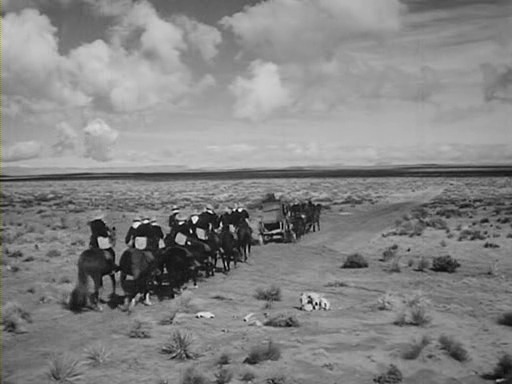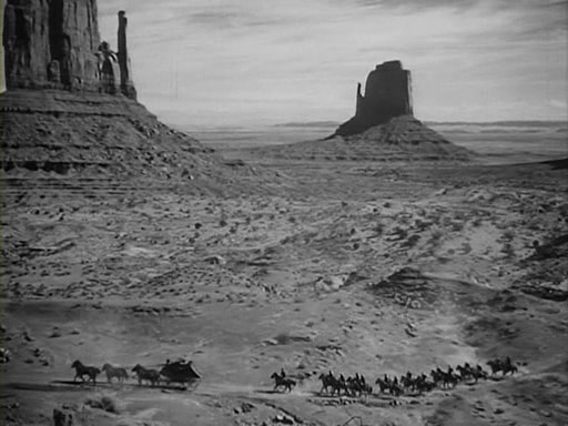 <모호크족의 북소리>와 같은 해에 나온 <역마차>는 존 포드의 초기 대표작이자, 이듬해 존 스타인벡 원작의 <분노의 포도>가 보여준 사회주의적 리얼리즘과는 확연히 구분되는 전형적인 서부극의 모습을 띠고 있습니다.