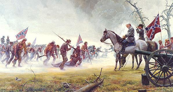 들판 서쪽 숲속으로부터 남군 주력부대 1만 5천명이 총검을 내밀면서 대오를 갖추고 푸른 사단기와 남부 연맹기를 중심으로 수많은 군기를 휘말리면 앞으로 전진하기 시작했습니다.