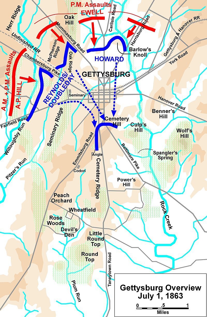 뷰포드는 물러나면서 게티즈버그의 바로 남쪽에 있는 말발굽 모양의 고지인 세메터리 릿지(Cemetery Ridge)에 부대를 배치시켰습니다.(사진:첫째날 전투양상도)