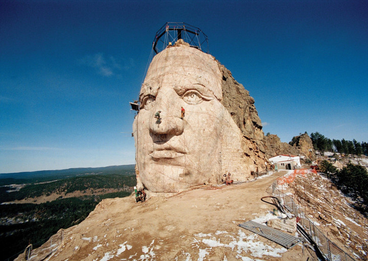 그러나 탄약이 떨어졌고 굶주림으로 더 이상의 항쟁은 불가능했습니다. 그러자 연방군은 항복하면 땅도 주고 살게 해주겠다고 회유를 해왔습니다. 크레이지 호스는 할 수 없이 항복을 했으나 이 역시 백인들의 사탕발림에 불과했습니다. 이에 분노한 크레이지 호스는 반항을 했으나 결국 유치장으로 질질 끌려가다가 첩보원 노릇을 하던 한 인디언의 손에 칼에 찔려 죽었습니다.(사진, 사우스다코타주에 있는 크레이지 호스 조각상, 거대한 바위를 깎아 만드는 이 작업은 지금도 계속 중에 있습니다)