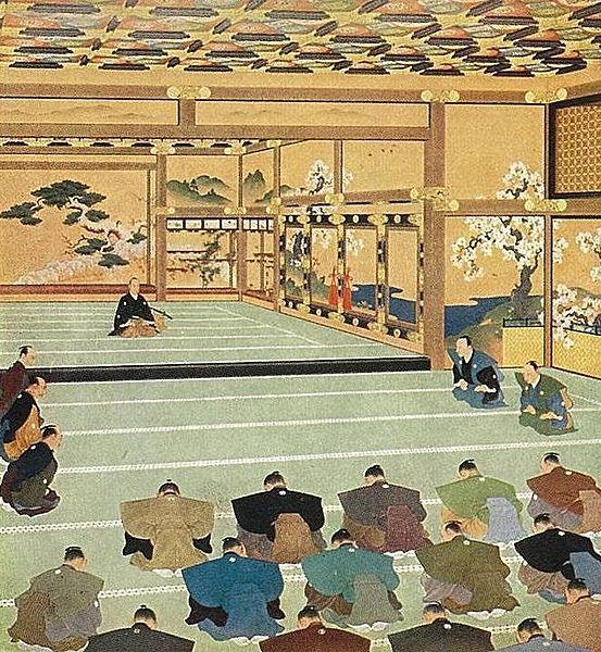 선중팔책과 대정봉환1867년 교토로 가는 배에서 료마는 대정봉환 등의 구상을 담은 선중팔책을 입안했다.[42][43] (이 선중팔책은 훗날 신정부강령팔책(新政府綱領八策) 이라는 메이지 정부의 기본 이념이 된다.) 대정봉환의 구상은 료마가 속했던 도사 번의 번주인 야마우치 도요시게가 도쿠가와 요시노부(德川慶喜)에게 건의하여 채택되었다. 이후 천황이 이를 받아들여 실제로 대정봉환이 이뤄졌고, 정권은 막부에서 천황 중심의 조정으로 평화적으로 넘어갔다. 이 사건으로 일본은 봉건시대를 종식하고 메이지 유신을 통한 중앙집권적 근대국가로 발전하게 된다.[1]