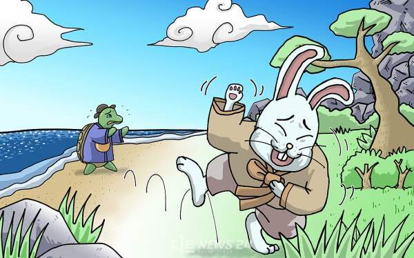 자라가 육지로 올라와 토끼와 조우하는 장면을 옮겨 봅니다.
