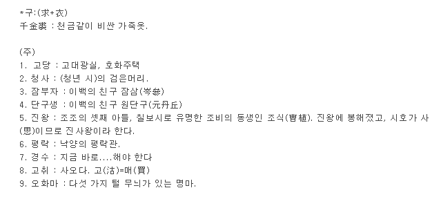 斗酒十千恣歡謔(두주십천자환학) : 한 말에 만량이나 하는 술 마음대로 즐겼다네
