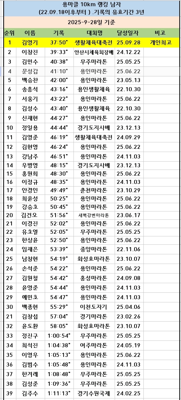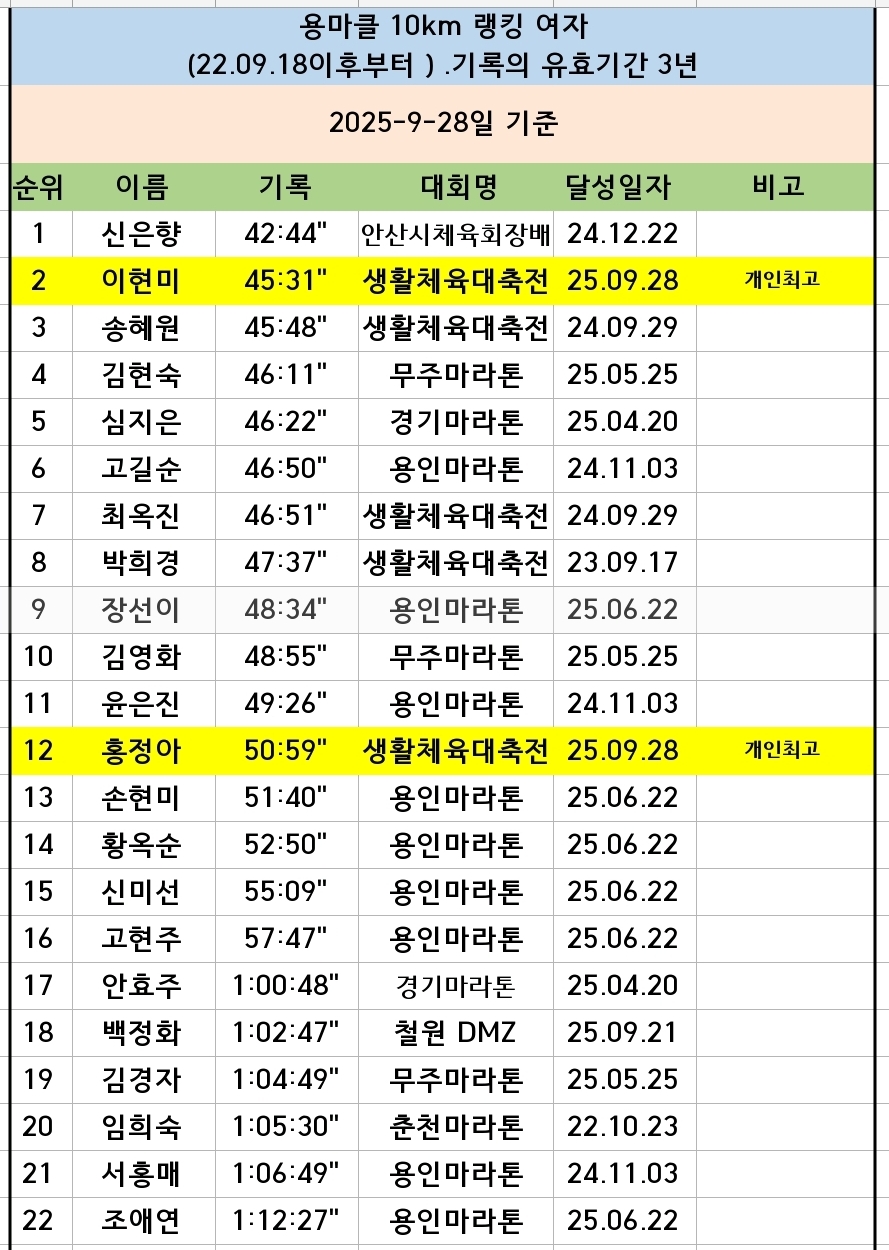 김영기 훈련국장님은 연일 PB 갱신을 하고 계시고, 이현미/홍정아님은 첫 랭킹진입에 개인최고 기록으로 랭크되셨습니다.