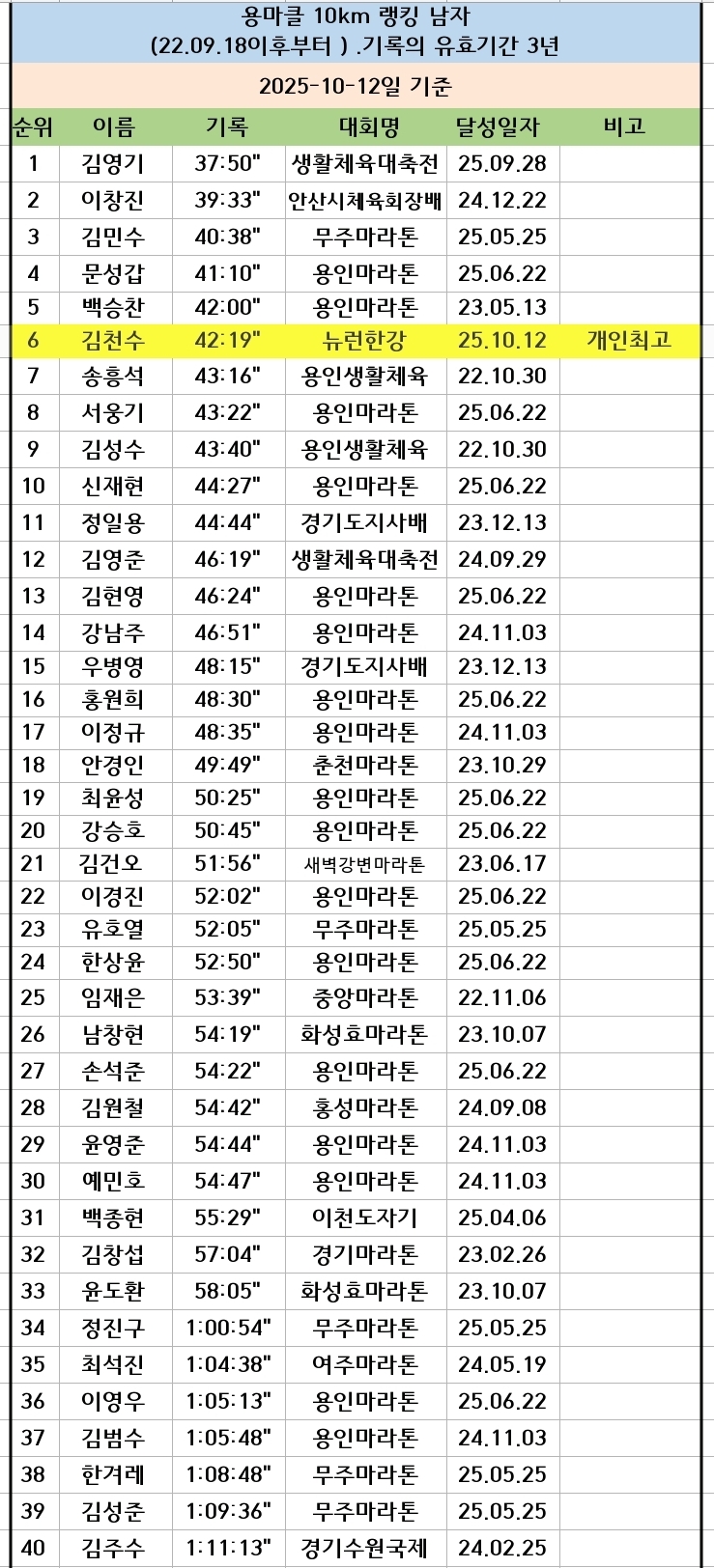뉴런한강마라톤(10k)에 참가하신 김천수님께서 개인최고기록을 달성하시며 10k 랭킹에 진입하셨습니다.