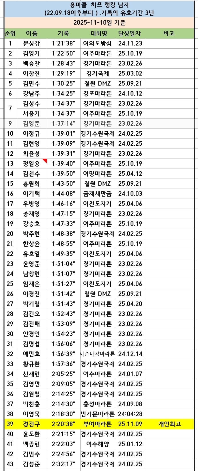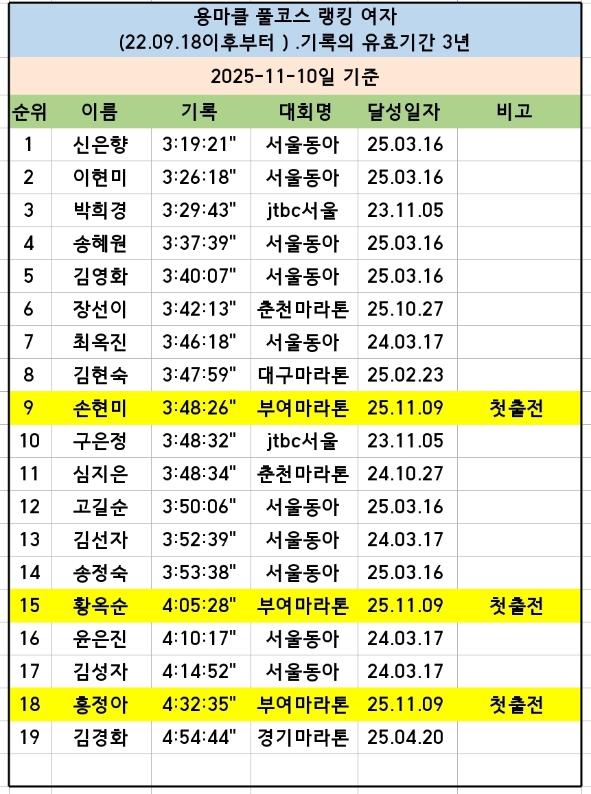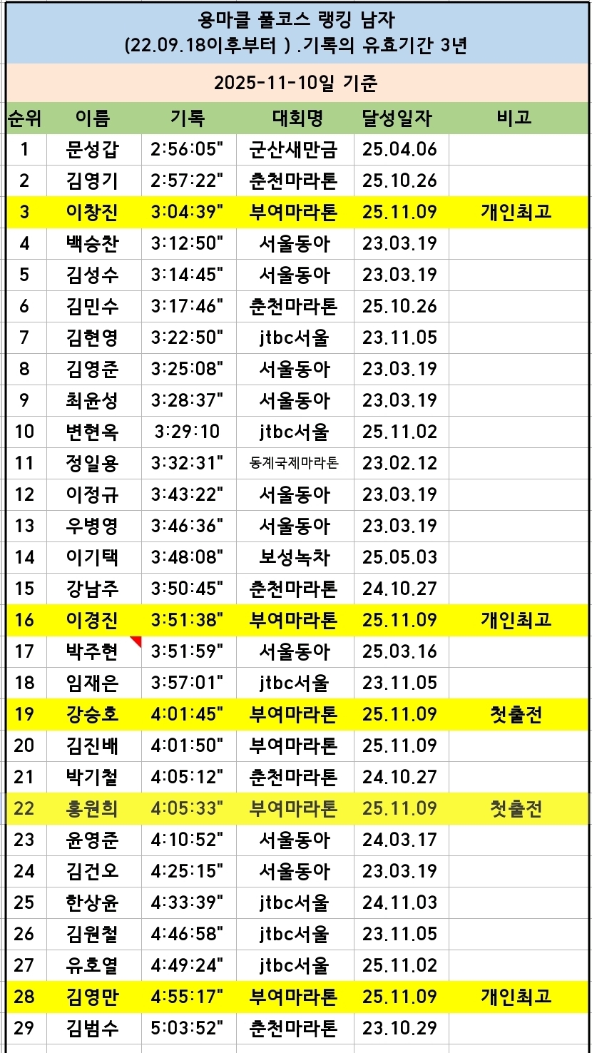 부여굿뜨래마라톤 기록을 반영하여 변동된 랭킹을 알려드립니다.