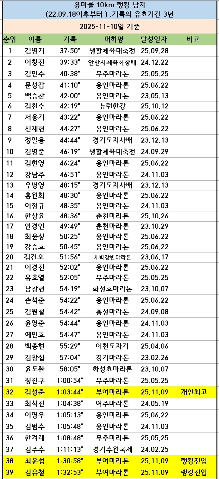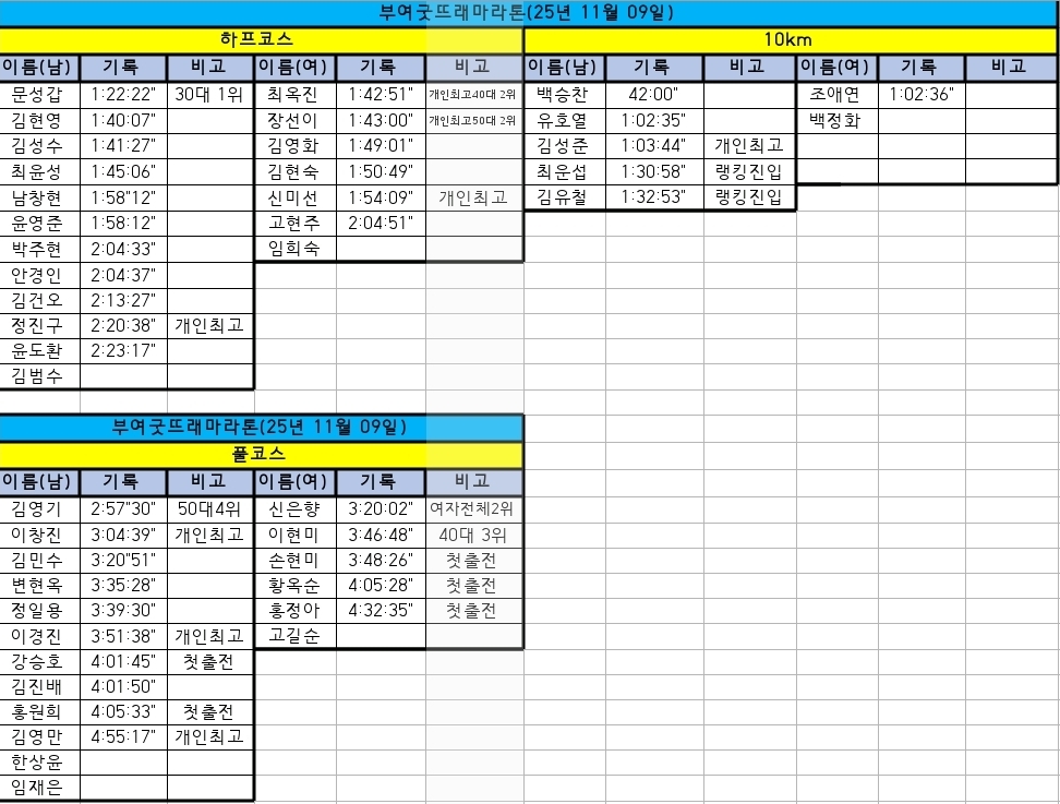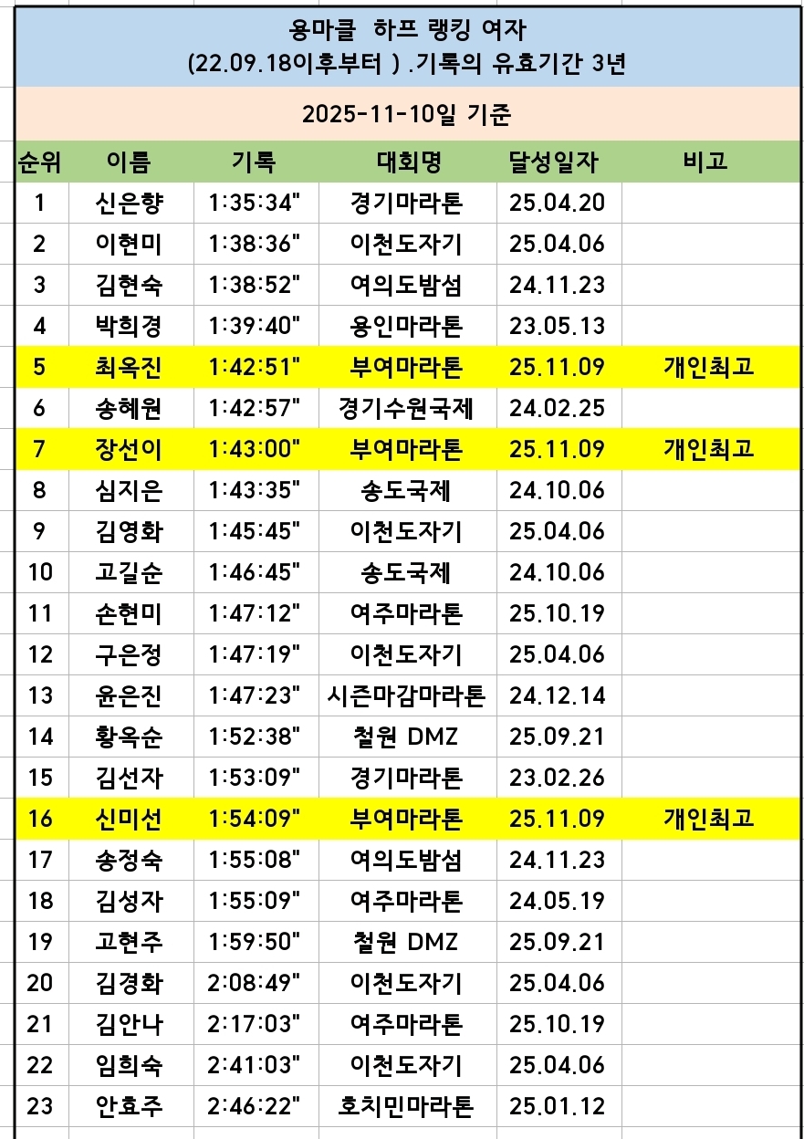 부여굿뜨래마라톤 기록을 반영하여 변동된 랭킹을 알려드립니다.