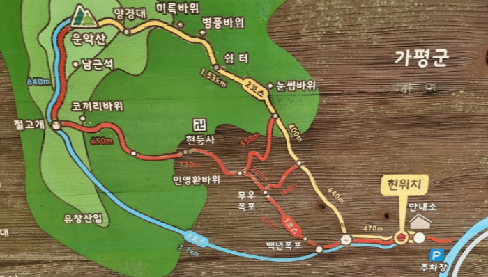 | 산행 일자 : 2023년 9월 1일(금요일) 산행할 곳 : 경기 가평군 조종면 운악리 452-1 운악산 산행 코스 : A팀 / 주차장→ 안내소(현등사입구)→ 갈림길(2코스) → 눈섭바위 → 쉼터 → 병풍바위 ⮌ ⮎ 미륵바위→ 망경대→ 운악산→ 남근석 → 절고개갈림길(1코스)→ 코끼리바위 ⮌ ⮎ 현등사(절)→ 민영환바위→ 무우폭포→ 출렁다리→ 백년폭포→ 갈림길 원점회귀, ( A팀 주행거리 / 5.73Km / 3시간30분 ~ 4시간 예상 ) B팀 / 주차장→ 안내소(현등사 입구)→ 갈림길(1코스)→ 무우폭포→ 출렁다리 → 민영환바위 ⮌ ⮎ 현등사(절)→ 주차장 원점회귀, ( B팀 주행거리 / 3.2Km / 1시간30분 ~ 2시간 예상,) ★ 산행 계획은 현지 여건 및 기상 상황에 따라 변경 또는 취소될 수 있습니다. ⭘ 人 당일 경비 : 35,000원 (버스 임차료, 하산음식, 기타경비 포함, ⭘ 중식, 간식, 식수, 상비약, 스틱, 여벌옷, 모자, 선글라스, 양산, 우산, 기타 등산 필수품, ▥ 하산 음식은 맛있는 이동갈비로 대체합니다. 버스 운행 : 송정한신A 06:25→ OB맥주 06:28→ 전화국 앞 06:30→ 하슬라 중앞 06:33→ 경찰서 옆 06:35 ⮌ ⮎ 로얄A 06:38→ 강여고 앞 06:40→ 구 한전 06:42→ 의료원삼거리 06:50 |