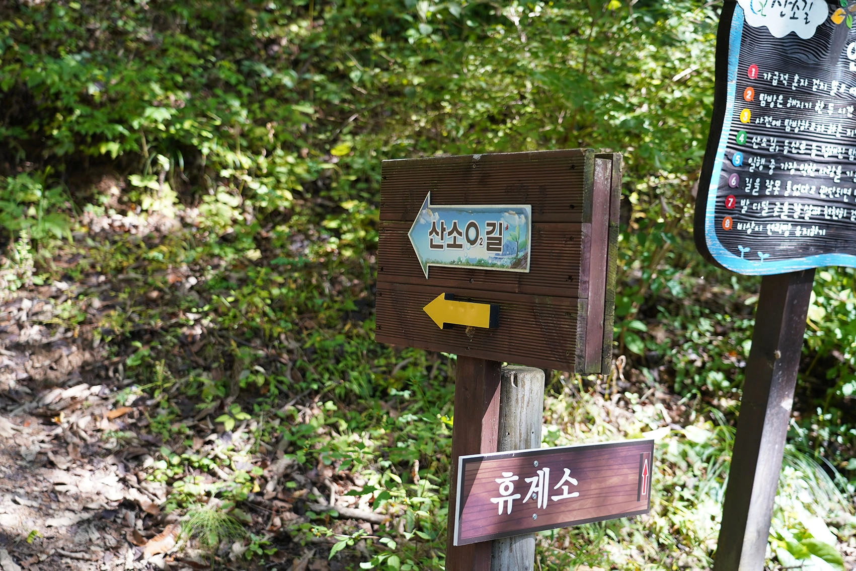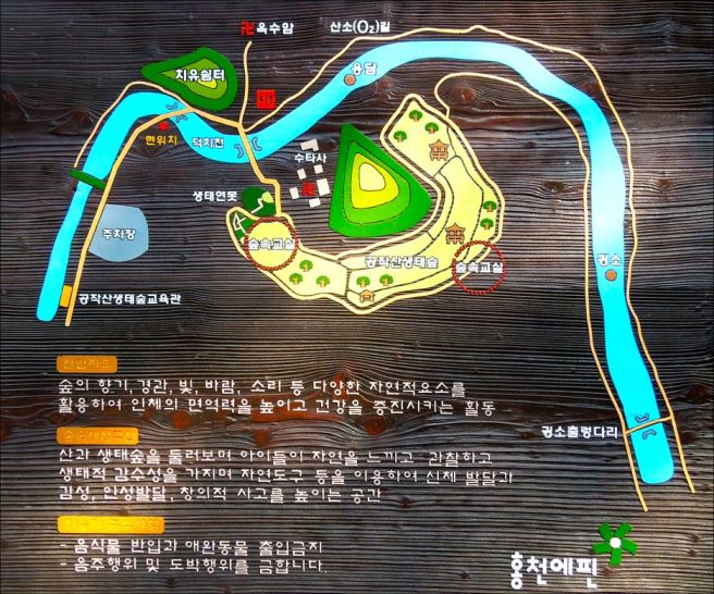 A팀 : 수타사주차장 - 생태숲 교육관 - 숲길잎구 -나무데크 쉼터 - 내리막 흙길 - 계곡길 시작(화장실)- 용담