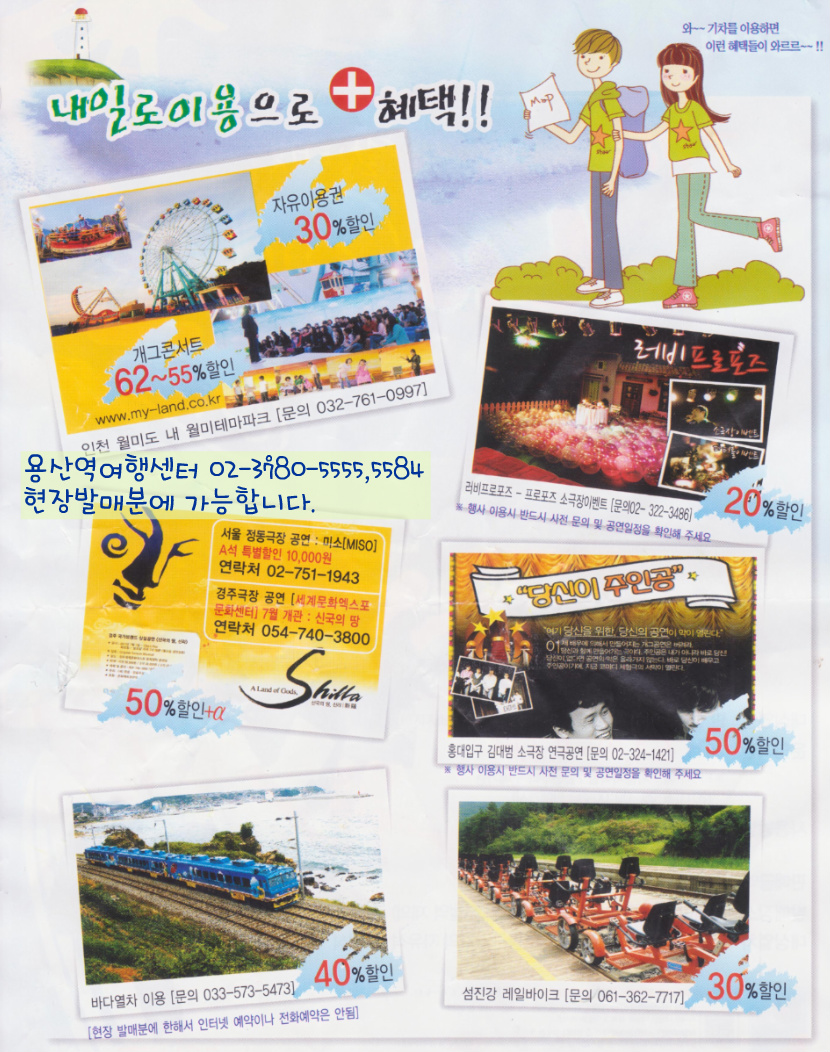 작성자이성재 작성자 본인 여부 작성자 작성시간 11.06.08 용산역 여행센터에서 드리는 혜택 1입니다. 용산역 여행센터 02-3780-5555로 전화주십시오. 또는 댓글질문 가능합니다