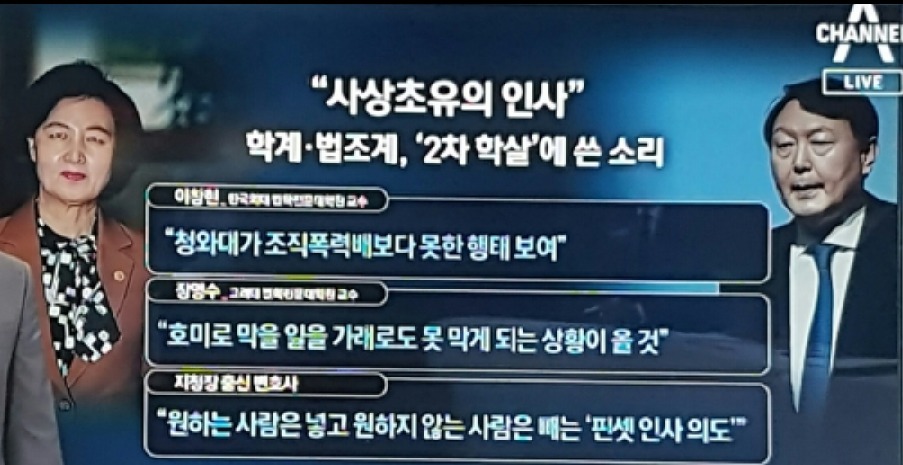 문재인 대통령이 새해 업무 첫날인 아침 7시에 서둘러 임명 재가한 추미애 법무부장관에 의해 7일 밤 윤석열 검찰총장의 핵심 측근 대부분을 지방으로 보내고, 법무부와 검찰 요직에 문재인 대통령과 가까운 간부들을 대거 전진 배치하는 검찰 인사를 단행했다. 추미애의 이러한 인사이동은 검사 인사에서 검찰총장 의견을 들으라고 규정한 검찰청법도 완전히 무시하고 윤석열 검찰총장과의 상의도 없이 패싱한 일방적 행태였다.