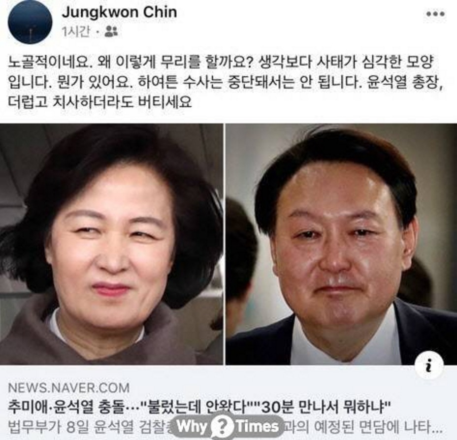 윤 총장은 박근혜 정부 시절 국가정보원 댓글 수사팀장으로 국정원 관계자들을 수사하던 도중 검찰 지휘부와 마찰을 빚고 2년 동안 좌천됐을 때도 사임하지 않았기 때문에 이번에도 잘 견뎌 주리라 믿는다.