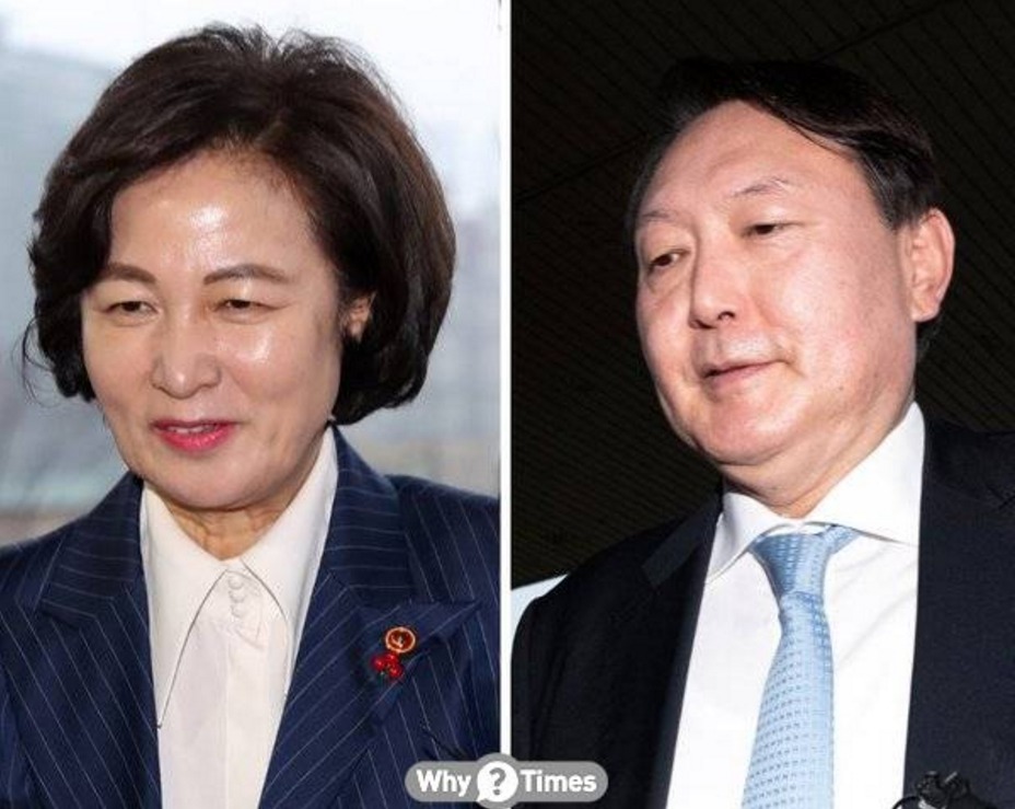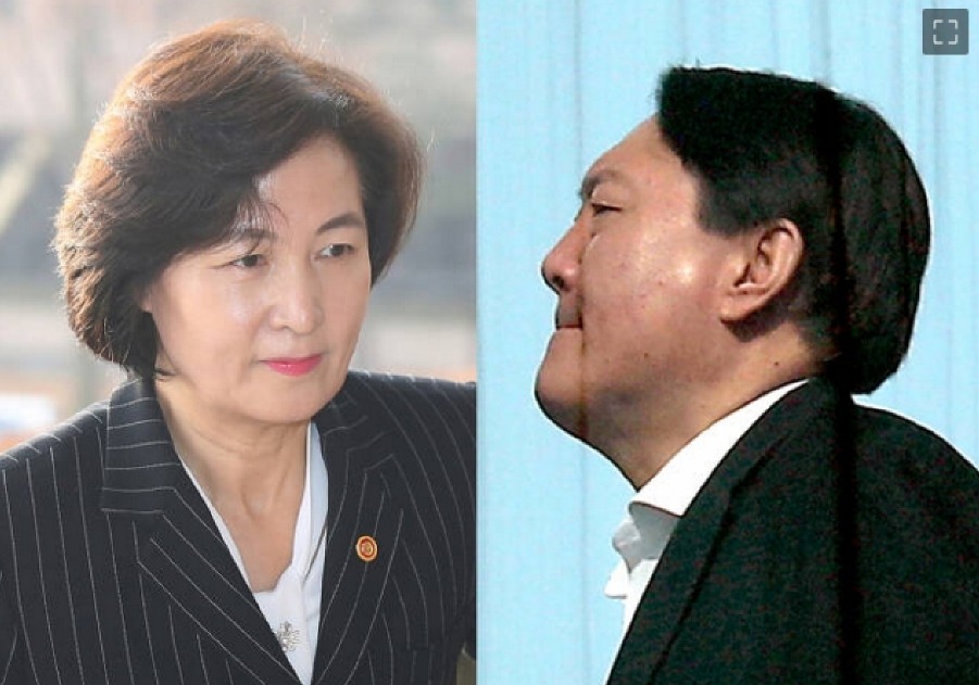 ▲ 1월 8일 검찰대학살을 주도한 추미애 법무부장관과 수족이 잘린 윤석열 총장 [사진=뉴시스]