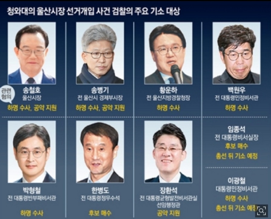 검찰이 발표한 A4용지 3장 분량의 보도자료에 따르면 기소 대상 13명은 2018년 울산시장 선거 과정에 다양한 방법으로 영향을 미쳤다. 청와대 하명(下命)에 따른 김기현 전 울산시장에 대한 경찰 수사, 송 시장에 대한 청와대의 공약 지원, 송 시장 경쟁 후보자를 매수해 단수 공천되게 하는 등 크게 세 갈래 의혹이 모두 기소 대상에 들어간 것이다. 문재인 대통령의 30년 지기인 송 시장의 울산시장 당선을 위해 청와대와 경찰 등 국가 조직이 직간접적으로 관여됐다는 것이 검찰의 판단이다.