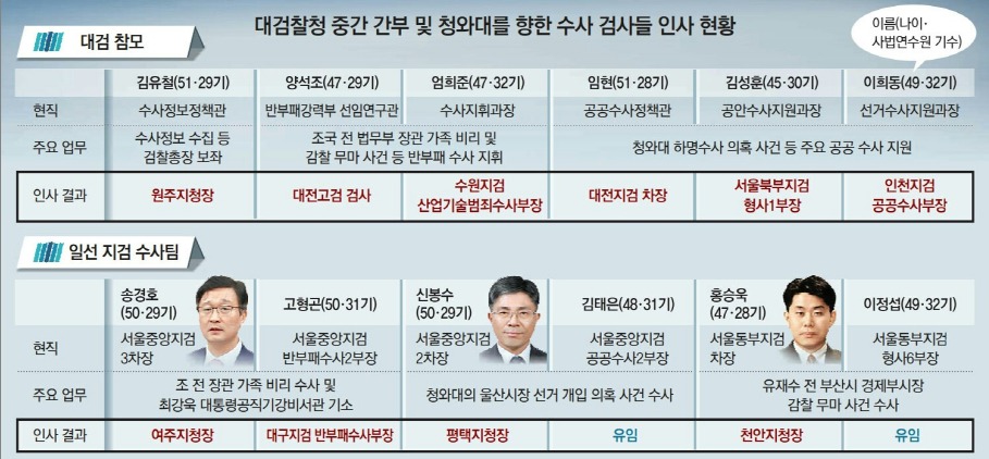 이번 인사로 청와대 선거개입 의혹 수사를 이끄는 신봉수 서울중앙지검 2차장검사는 평택지청장으로, 조국 전 법무부 장관 일가 의혹을 수사한 송경호 서울중앙지검 3차장검사는 여주지청장으로 발령이 났다.