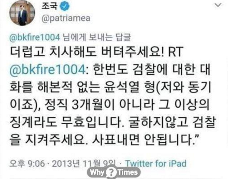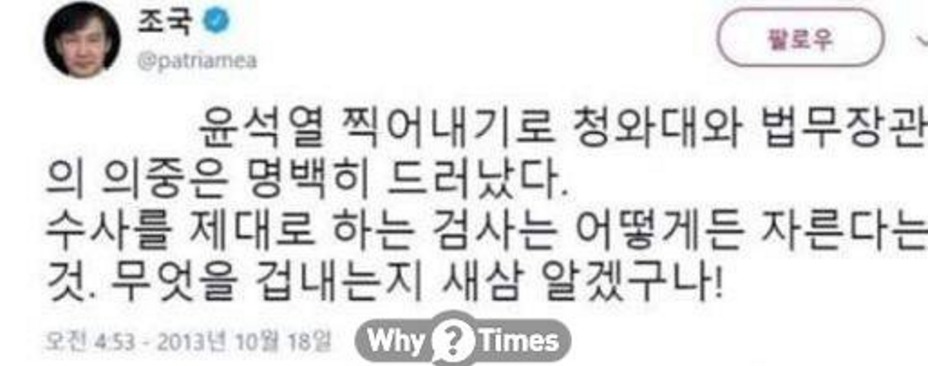 이러한 사태가 올 것이라고 예견이라도 한 것일까? 조국은 지난 2013년 10월 18일 자신의 트위터를 통해 “윤석열 찍어내기로 청와대와 법무장관의 의중은 명백히 드러났다”며 “수사를 제대로 하는 검사는 어떻게든 자른다는 것, 무엇을 겁내는지 새삼 알겠구나!”라고 썼었다.