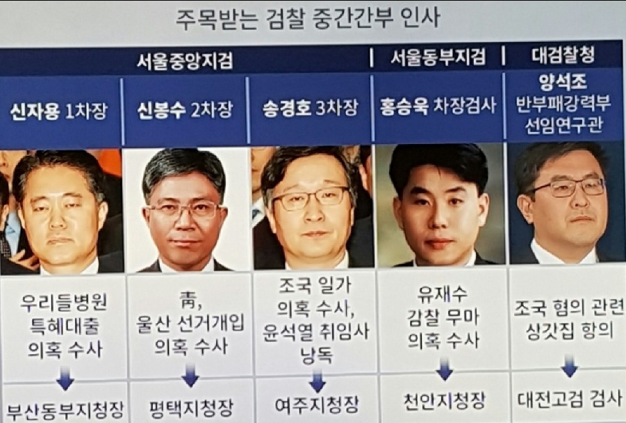 이날 조국 전 법무부 장관의 가족비리·감찰무마 의혹과 청와대 하명수사·선거개입 의혹 수사를 지휘한 서울중앙지검 차장검사들도 모두 교체됐다. 신봉수 2차장 검사는 평택지청장으로, 송경호 3차장은 여주지청장으로 각각 발령이 났다.