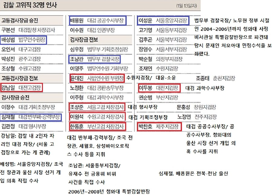 청와대 감찰무마 의혹을 수사한 홍승욱 서울동부지검 차장검사는 천안지청장으로 자리를 옮기게 됐다. 일각에서 정권실세 연루 의혹이 제기되고 있는 우리들병원 대출 관련 의혹을 수사 중인 신자용 서울중앙지검 1차장도 부산동부지청장으로 가게 됐다.