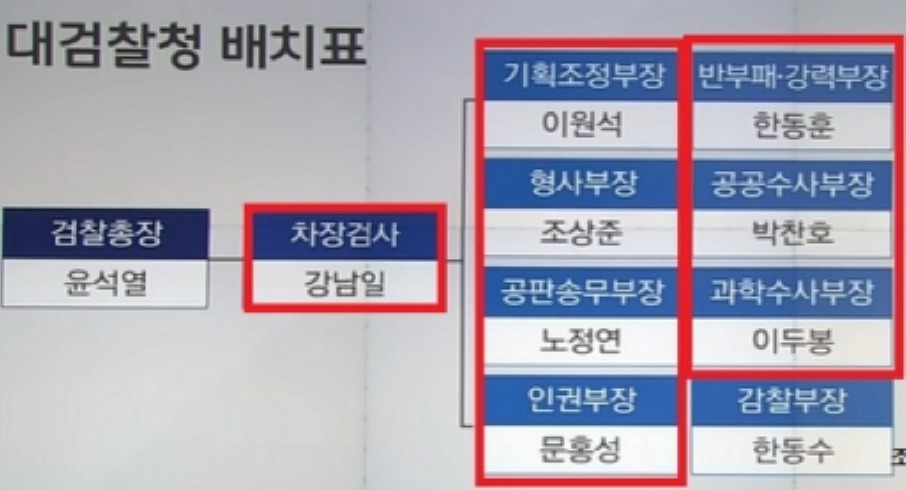 윤석열 검찰총장을 보좌한 참모진등이 대부분 교체됐다. 고검장 승진 5명과 검사장 승진 5명 전보 22명에 달하는 대폭적인 규모다.