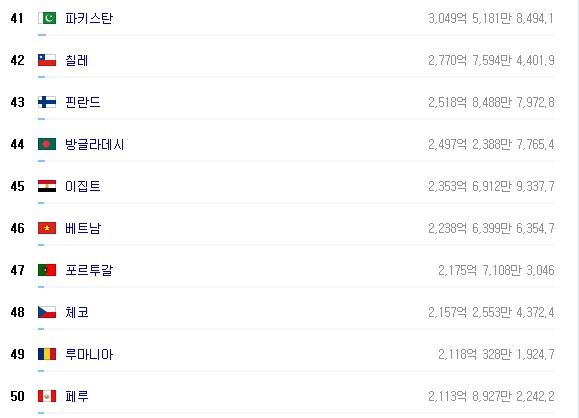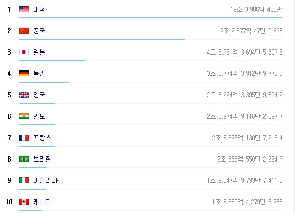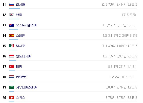 한국 국내총생산(당해년가격) 1조 5,302억 달러 (12위)