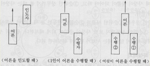 어른을 1인이 수행할 때는 수행자가 어른의 2~3보 뒤의 우측에 선다. 그래야 앞에서 볼 때 수행자가 하석에 있게 된다.
