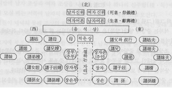 당연히 남자 자손은 상좌의 좌측인 동쪽에 위치하고 여자 자손은 상좌의 우측인 서쪽에 위치하며, 상좌에서 가까운 앞쪽이 상이고 상좌에서 먼 뒤쪽이 하석이고, 남녀가 좌우로 갈라섰을 뿐 아니라 중앙에 의식을 행하는, 절하는 자리가 마련되므로 중앙이 상이고 양단이 하석이 된다.