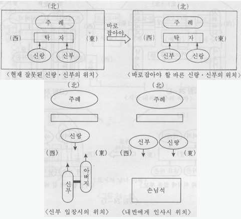 남자가 서쪽, 여자가 동쪽에 위치하는 것은 죽은 사람의 경우임은 뒤에 설명하는 신위와 시체의 위치에서 밝혀지듯이 현재의 신식 혼인예식에서의 신랑과 신부는 죽은 신위, 또는 묘지에 매장된 시체의 남녀 위치인 것이다. 당연히 바꿔야 할 것이다.