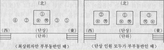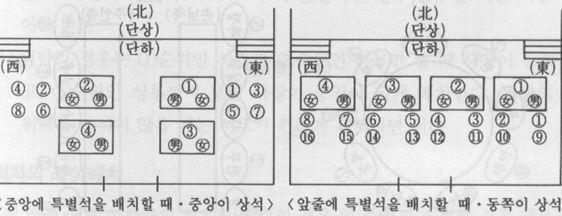 ③ 단하의 참석자가 남녀 합석인 때는 동쪽에 남자가 위치하고 서쪽에 여자가 위치한다. 남녀가 같은 수인 때는 중앙을 분리선으로 하고, 한 쪽이 많고 적을 때는 적절히 배치해 남동여서로 분리한다.