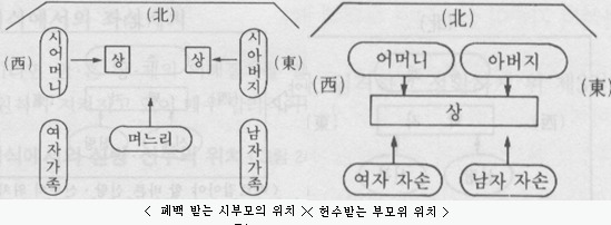 ① 며느리의 현구고례(폐백)를 받는 시부모는 “시아버지와 시어머니가 상좌에 앉는데 시아버지(舅)가 동쪽이고 시어머니(姑)가 서쪽이다.”라고 현구고례(見舅姑禮)조에 명시되어 있다. 역시 상좌가 북쪽으로 간주되어 상좌의 좌측이 동쪽이고 상좌의 우측이 서쪽이 된다.