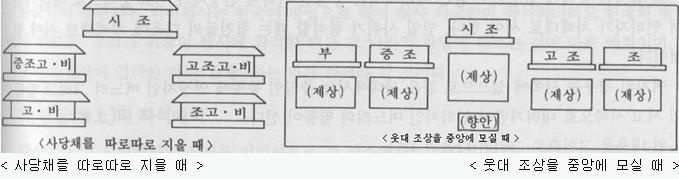 이상 설명한 내용은 같은 열에 한 줄로 모시는 경우인데, 형편이 넉넉해서 사당채를 조상에 따라 따로 짓거나 아니면 제일 웃대 조상을 중앙에 모시고 아랫대 조상을 양쪽으로 모시는 경우에는 그림과 같이 모신다.