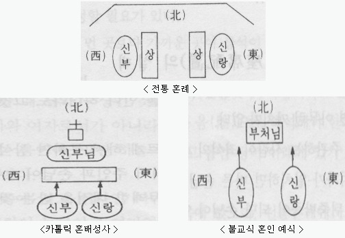 이와 같이 동양의 전통혼례와 기타 지역의 관습 및 종교의식이 모두 상좌를 북쪽으로 간주해 신량이 동쪽이고, 신부가 서쪽인데 반해 우리나라의 신식 혼인 예식은 신랑이 서쪽, 신부가 동쪽으로 정반대로 되었다.