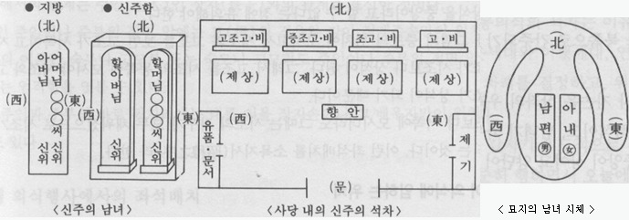 하나의 지방에 남자 조상과 여자 조상을 나란히 쓸 때나 하나의 신주함(독·櫝)에 내외분의 신주를 함께 모실 때는 서쪽에 남자 위패, 동쪽에 여자 위패를 쓰고 모신다.