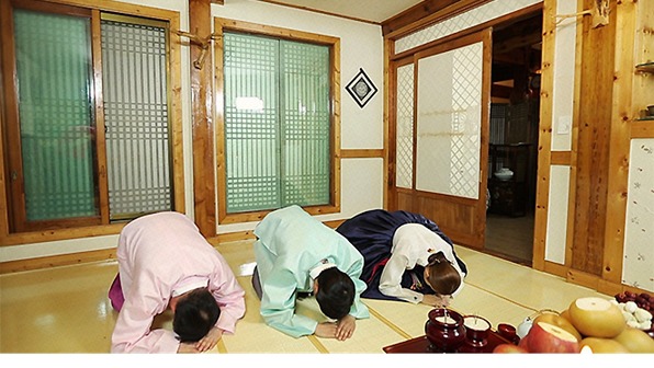 출입구 문을 열어 놓고 모든 참사자는 일제히 두 번 절한다.