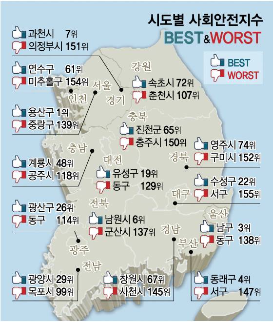 전국 시·군·구 중 표본 숫자가 적은 지역을 제외한 155곳을 대상으로 경제활동, 생활안전, 건강보건, 주거환경을 종합한 사회안전지수 순위를 매겼다.