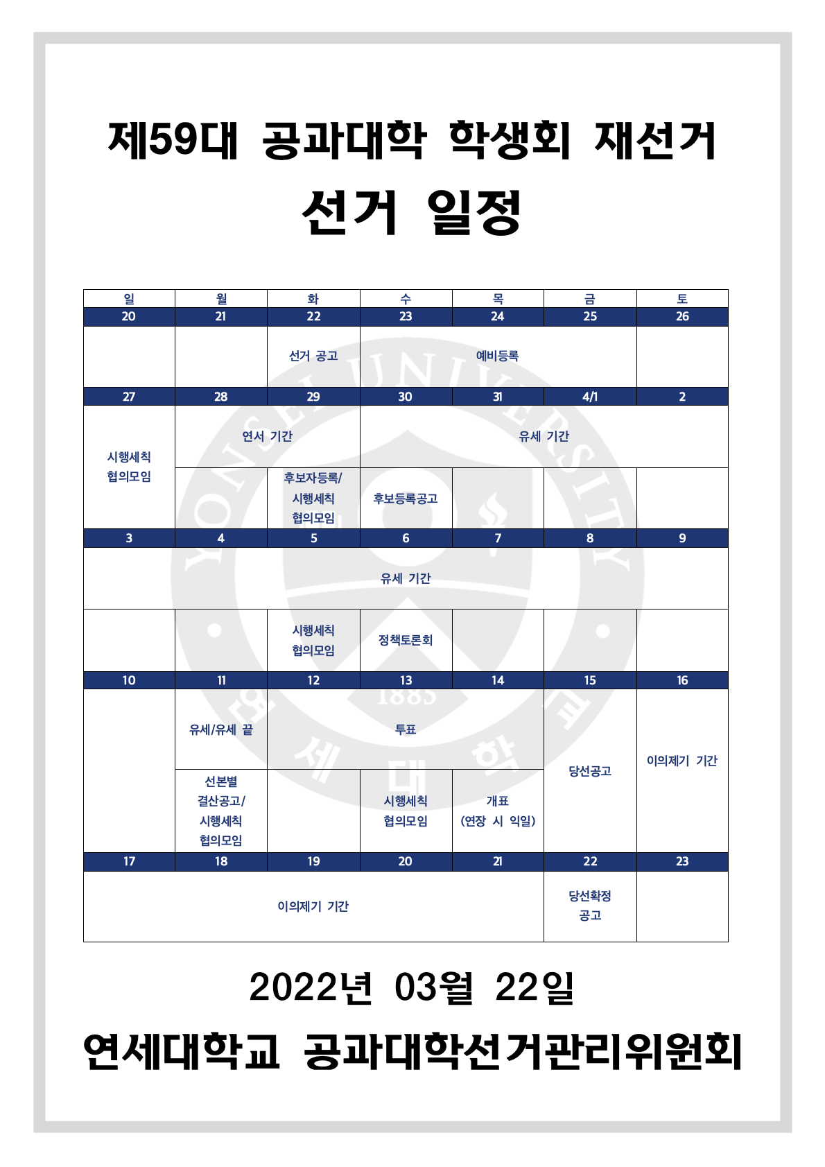 Re: 1. 단위별 선거 일정 및 선거시행세칙 수합 (마감일 3/27 일) _ 공과대학 작성자공선관위원장 김원강|작성시간22.03.28|조회수38 목록 댓글 0 글자크기 작게가 글자크기 크게가 연세대학교 공과대학 학생회 선거 및 학생총투표에 관한 시행세칙 201030.pdf309.97KB 첨부파일첨부된 파일이 2개 있습니다. png 파일 재선거 일정.png 다운로드 pdf 파일 연세대학교 공과대학 학생회 선거 및 학생총투표에 관한 시행세칙 201030.pdf 다운로드 다음검색 현재 게시글 추가 기능 열기 북마크 공유하기 신고 센터로 신고 댓글 댓글 0 댓글쓰기 답글쓰기 댓글 리스트