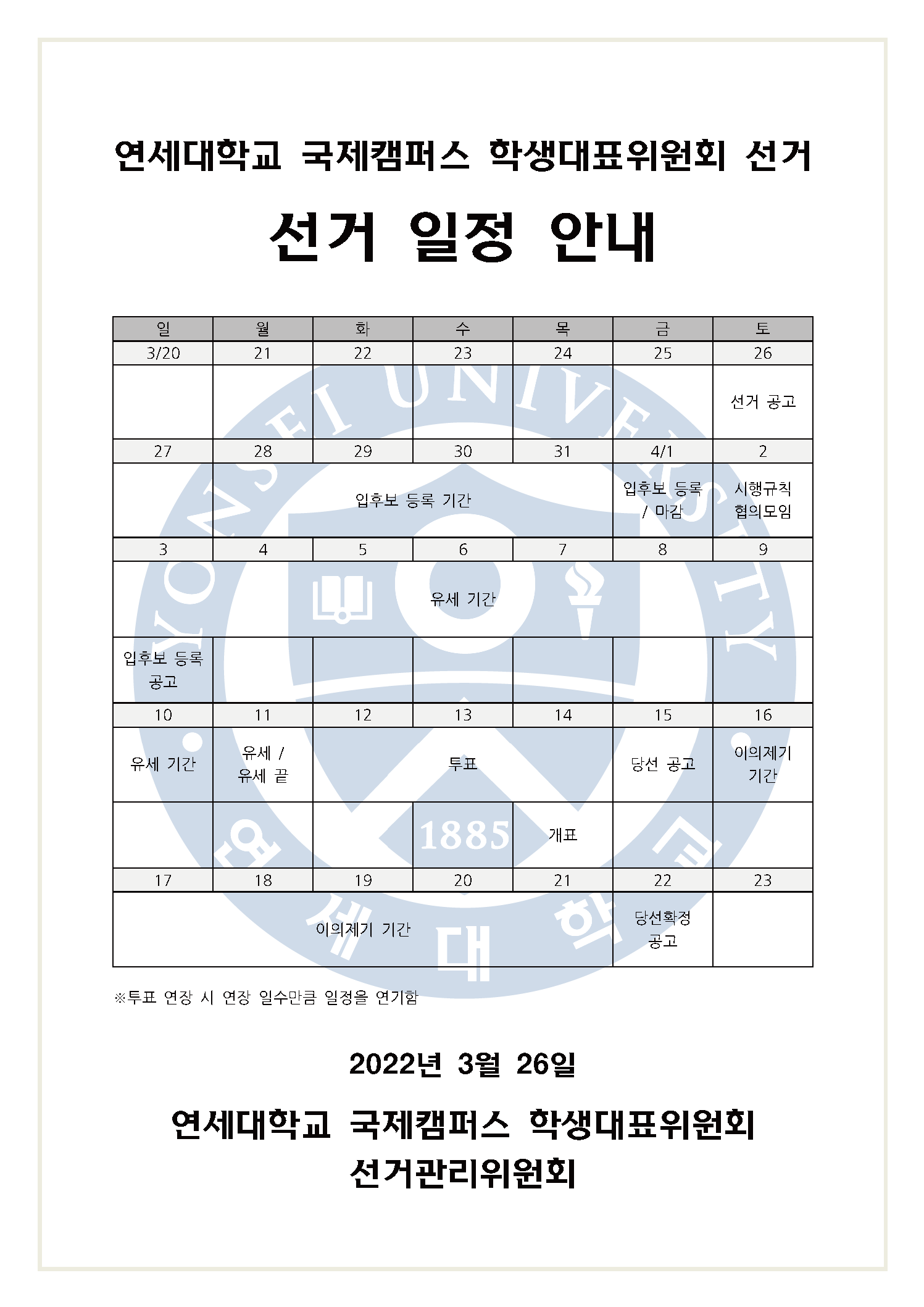 Re: 1. 단위별 선거 일정 및 선거시행세칙 수합 (마감일 3/27 일) _ 국학위(국제캠퍼스 학생대표위원회) 작성자국학위선관위장 박규빈|작성시간22.03.29|조회수35 목록 댓글 0 글자크기 작게가 글자크기 크게가 연세대학교 국제캠퍼스 학생대표위원회 하우스대의원 선거시행규칙.pdf259.08KB 첨부파일첨부된 파일이 2개 있습니다. png 파일 선거일정.png 다운로드 pdf 파일 연세대학교 국제캠퍼스 학생대표위원회 하우스대의원 선거시행규칙.pdf 다운로드 다음검색 현재 게시글 추가 기능 열기 북마크 공유하기 신고 센터로 신고 댓글 댓글 0 댓글쓰기 답글쓰기 댓글 리스트