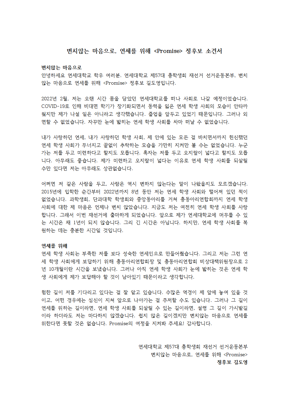 안녕하세요 연세대학교 학우 여러분. 연세대학교 제57대 총학생회 재선거 선거운동본부, 변치않는 마음으로 연세를 위해 <Promise> 정후보 길도영입니다.