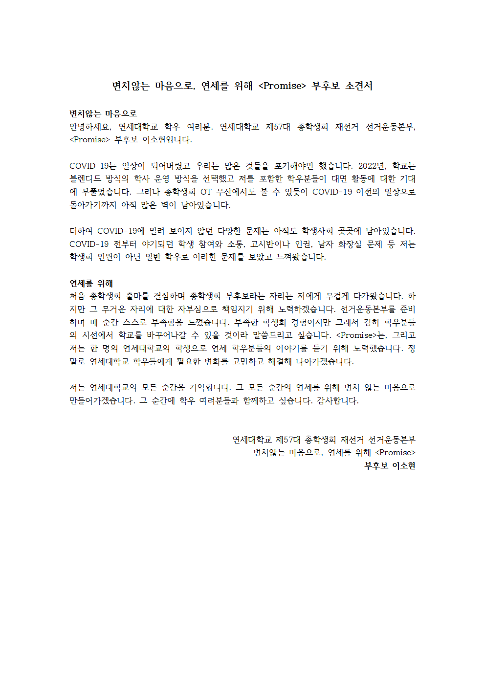 안녕하세요, 연세대학교 학우 여러분. 연세대학교 제57대 총학생회 재선거 선거운동본부, <Promise> 부후보 이소현입니다.
