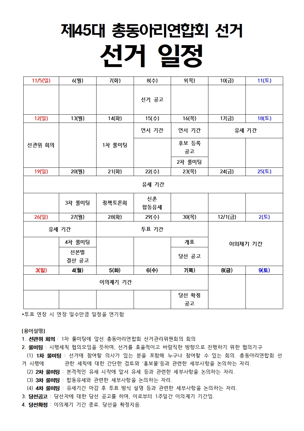 Re: 1. 단위별 선거 일정 및 선거시행세칙 수합 (마감일 11/12 일)_총동아리연합회 작성자총선거관리위원장 노명진|작성시간23.11.11|조회수27 목록 댓글 0 글자크기 작게가 글자크기 크게가 총동아리연합회 선거 시행에 관한 세칙 (23.03.07).pdf123.50KB 첨부파일첨부된 파일이 2개 있습니다. jpg 파일 제45대 총동아리연합회 선거 일정.jpg 다운로드 pdf 파일 총동아리연합회 선거 시행에 관한 세칙 (23.03.07).pdf 다운로드 다음검색 현재 게시글 추가 기능 열기 북마크 공유하기 신고 센터로 신고 댓글 댓글 0 댓글쓰기 답글쓰기 댓글 리스트