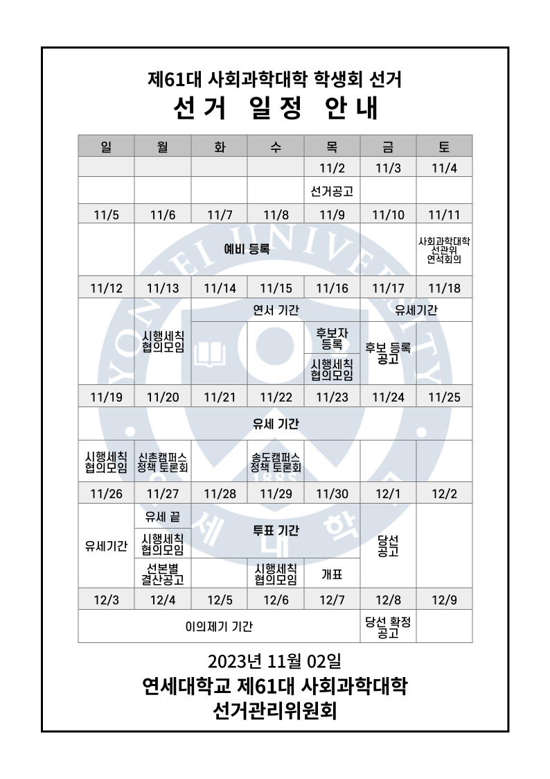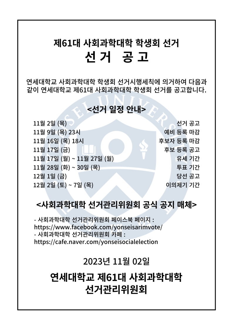 Re: 1. 단위별 선거 일정 및 선거시행세칙 수합 (마감일 11/12 일)_사회과학대학 작성자사선관위원장 김다현|작성시간23.11.12|조회수31 목록 댓글 0 글자크기 작게가 글자크기 크게가 사회과학대학 선거시행세칙 (2023).hwp185.50KB 첨부파일첨부된 파일이 3개 있습니다. png 파일 사회과학선거공고-001.png 다운로드 png 파일 제61대 사회과학대학 학생회 선거 일정.png 다운로드 hwp 파일 사회과학대학 선거시행세칙 (2023).hwp 다운로드 다음검색 현재 게시글 추가 기능 열기 북마크 공유하기 신고 센터로 신고 댓글 댓글 0 댓글쓰기 답글쓰기 댓글 리스트