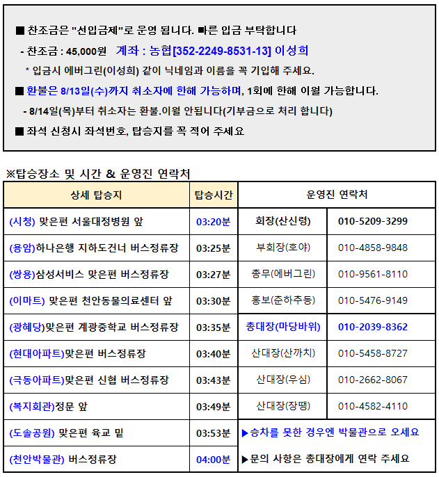 이에 동의 하시면 산행 신청 하시고 운영진의 통솔에 적극 협조 바랍니다.