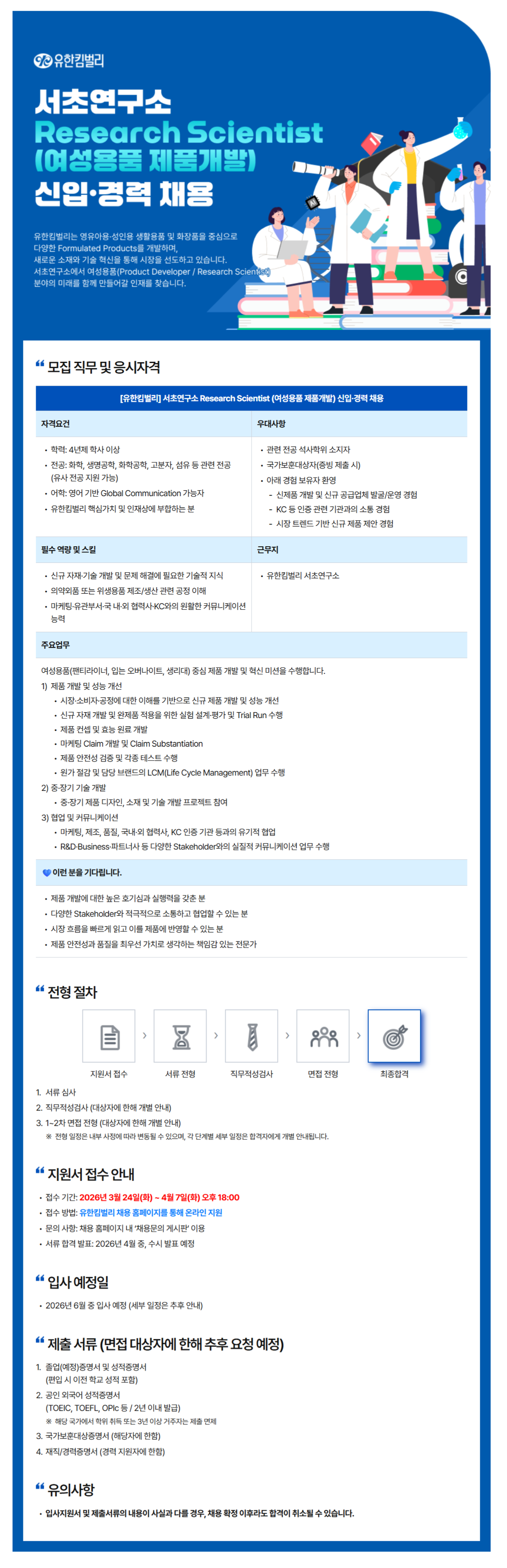 [유한킴벌리(주)][유한킴벌리] 서초연구소 Research Scientist (여성용품 제품개발) 신입 및 경력 채용 (~04.07)