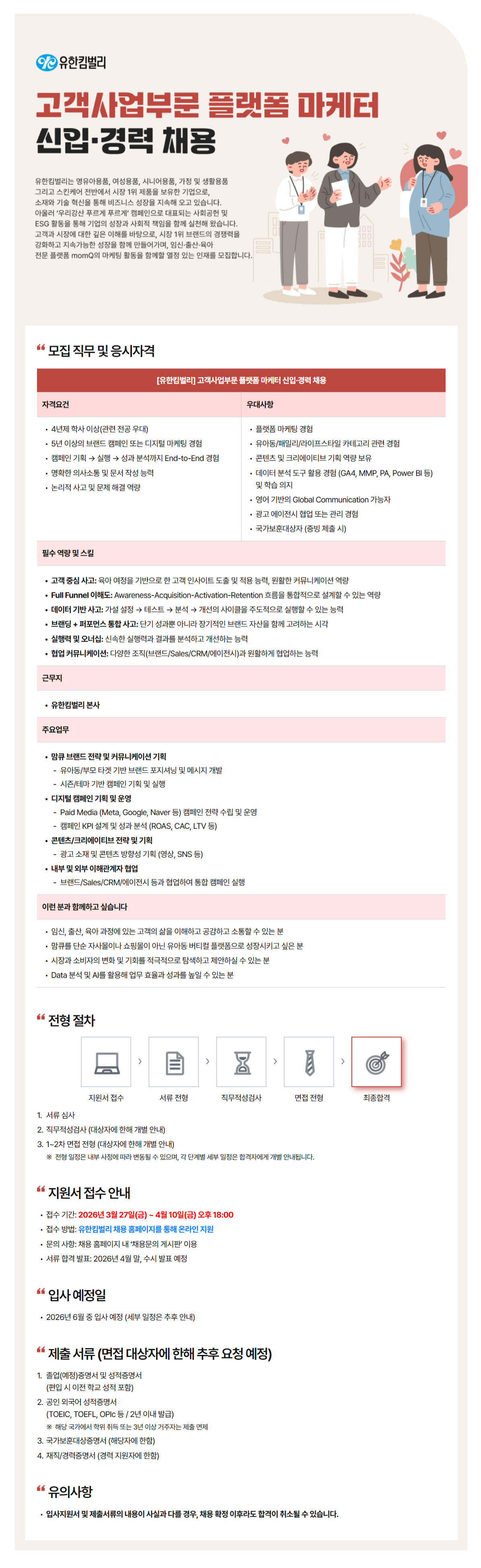 [유한킴벌리] 고객사업부문 플랫폼 마케터 신입 및 경력 채용