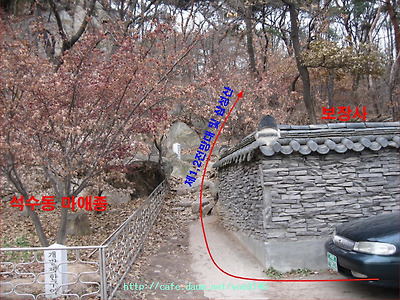 좌회전하여 50m정도 가면 우측으로 보장사와 석수동 마애종 사이에 등산로입구가 있음.